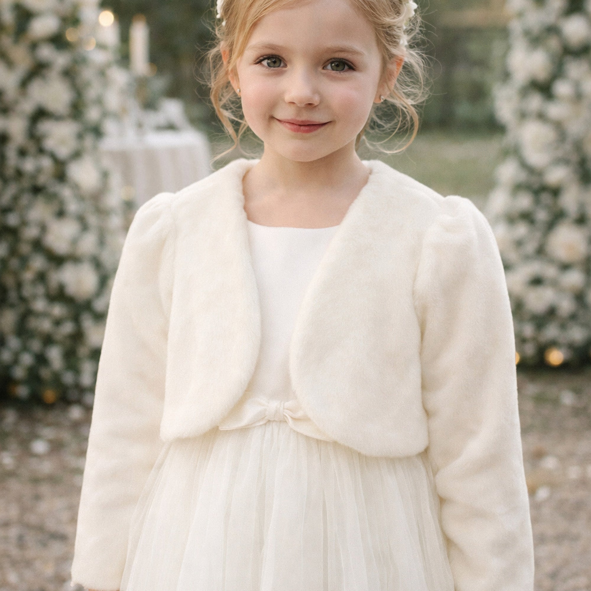 This beautiful stylish collarless fluffy faux fur bolero is perfect for any of our dresses.