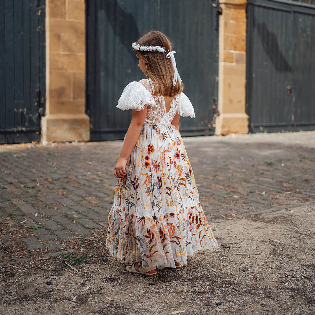 The Enchanted Fall Dress in Chantilly Lace is made for flower girls who steal the spotlight — and hearts. Designed in rich, seasonal hues and crafted from high-quality fabrics, this dress blends whimsical charm with couture-inspired elegance. From rustic barns to golden garden aisles, she’ll fit right into the magic of your fall wedding.