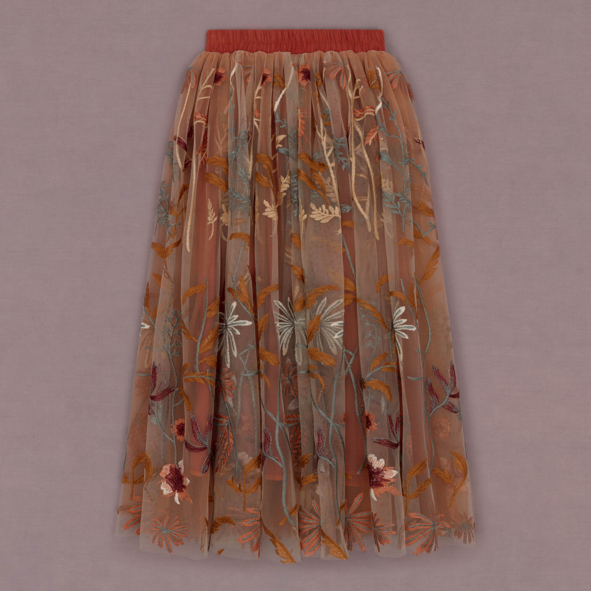 The Felicity Couture Set pairs the softest lace crop top with a flowing, layered tulle skirt in a rich rustic orange. The skirt features delicate embroidery and falls to a graceful maxi length, depending on height, with a fully lined finish and a gently elasticated waistband for comfort and movement.