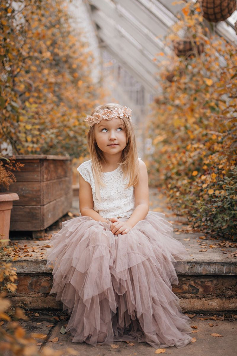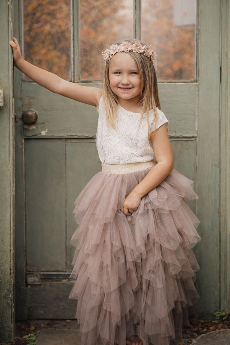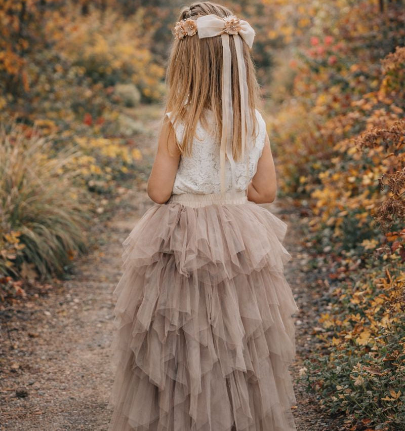 Der weiche Rock in Nude-Latte hat eine maximale Länge, je nach Körpergröße des Kindes. Viele Lagen machen den Rock perfekt zum Drehen, mit elastischem Bund und vollständig gefüttert.