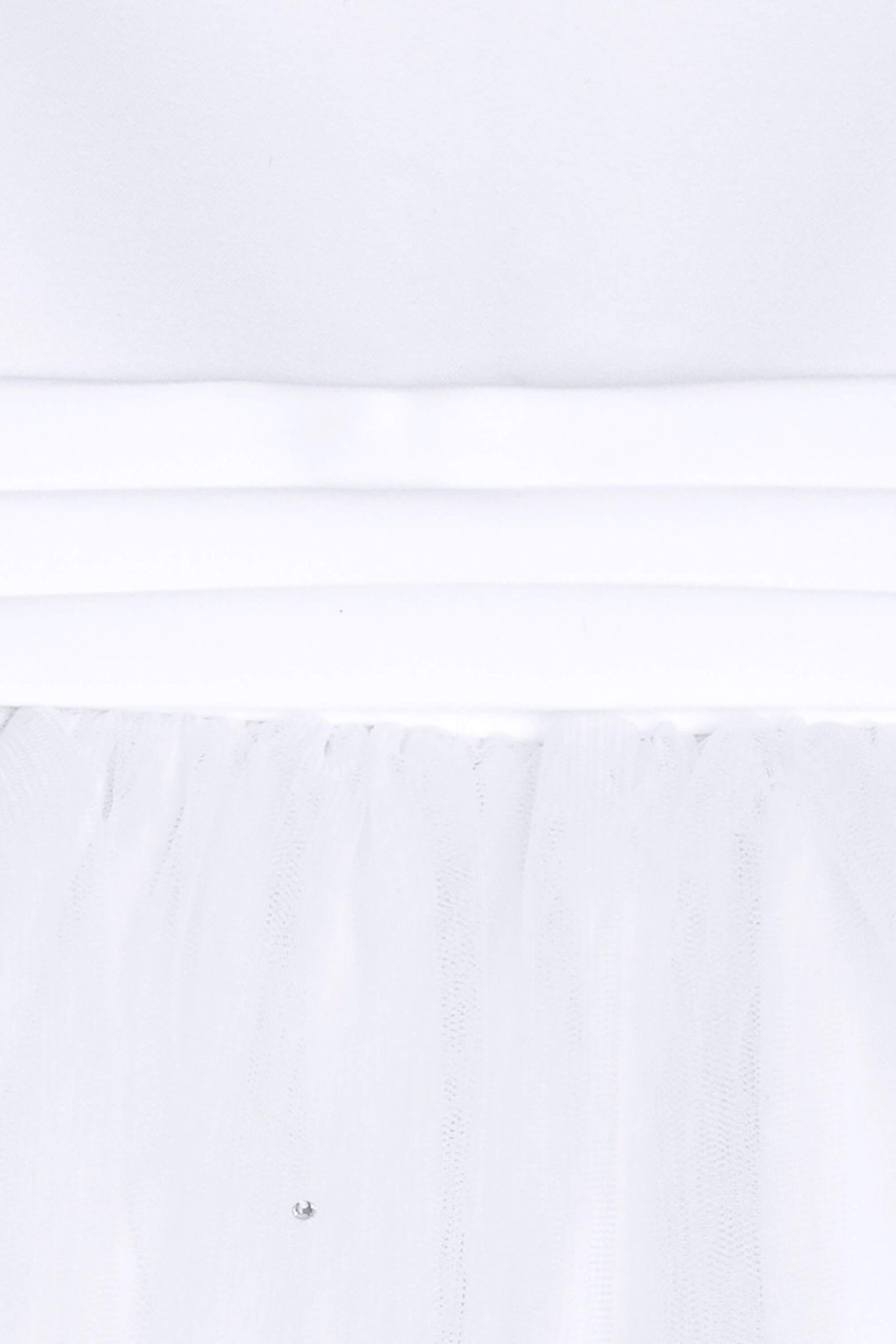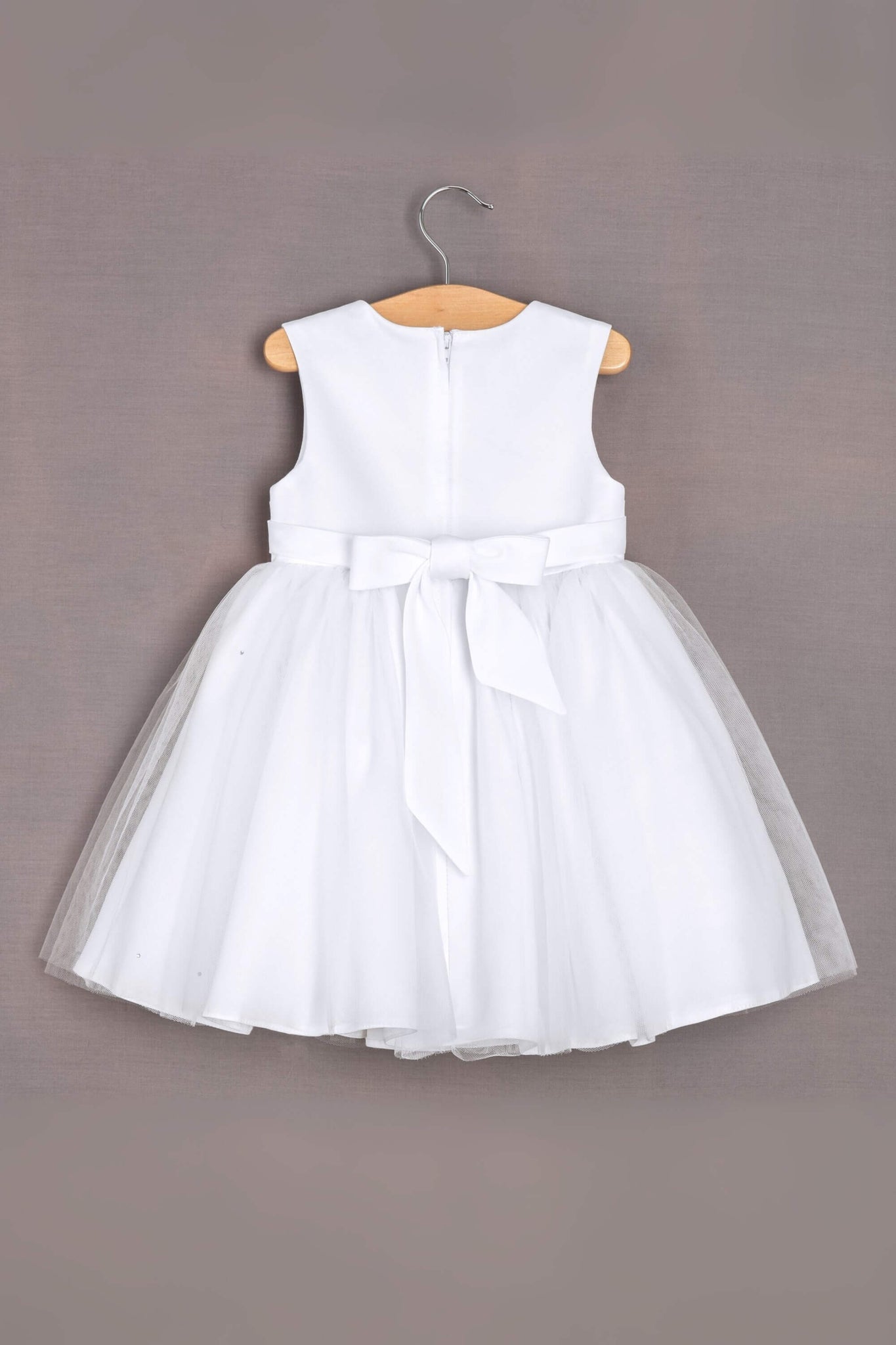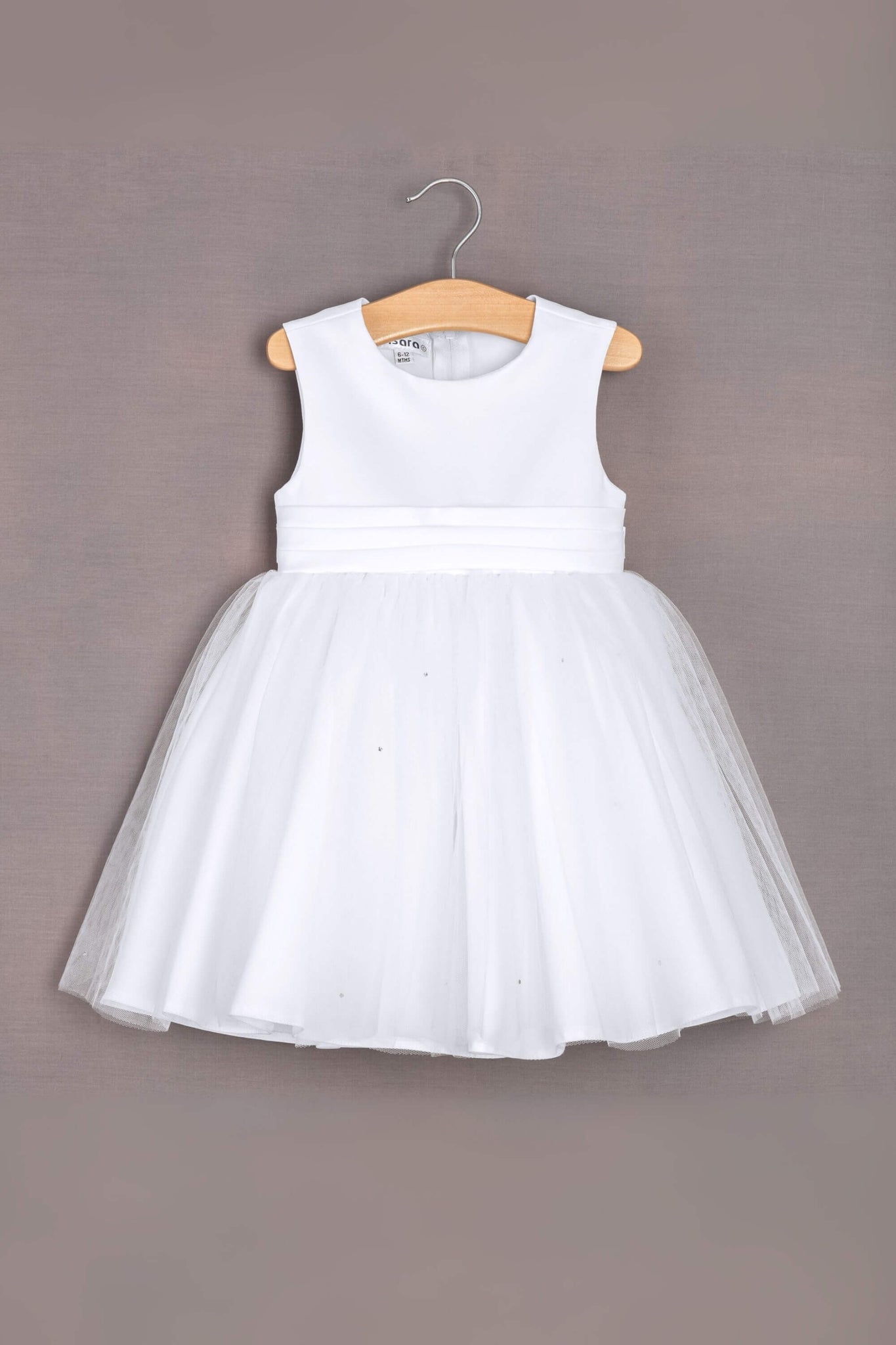 Dieses wunderschöne, strahlend weiße Blumenmädchenkleid verfügt über ein schlichtes Oberteil im klassischen Stil, einen Taillenbund und eine schmale Taille, die für einen voluminösen Rock sorgt. Auf der obersten Tüllschicht des Kleides sind winzige Glitzersteine verstreut. Dieses Kleid ist ideal für jeden formellen Anlass.