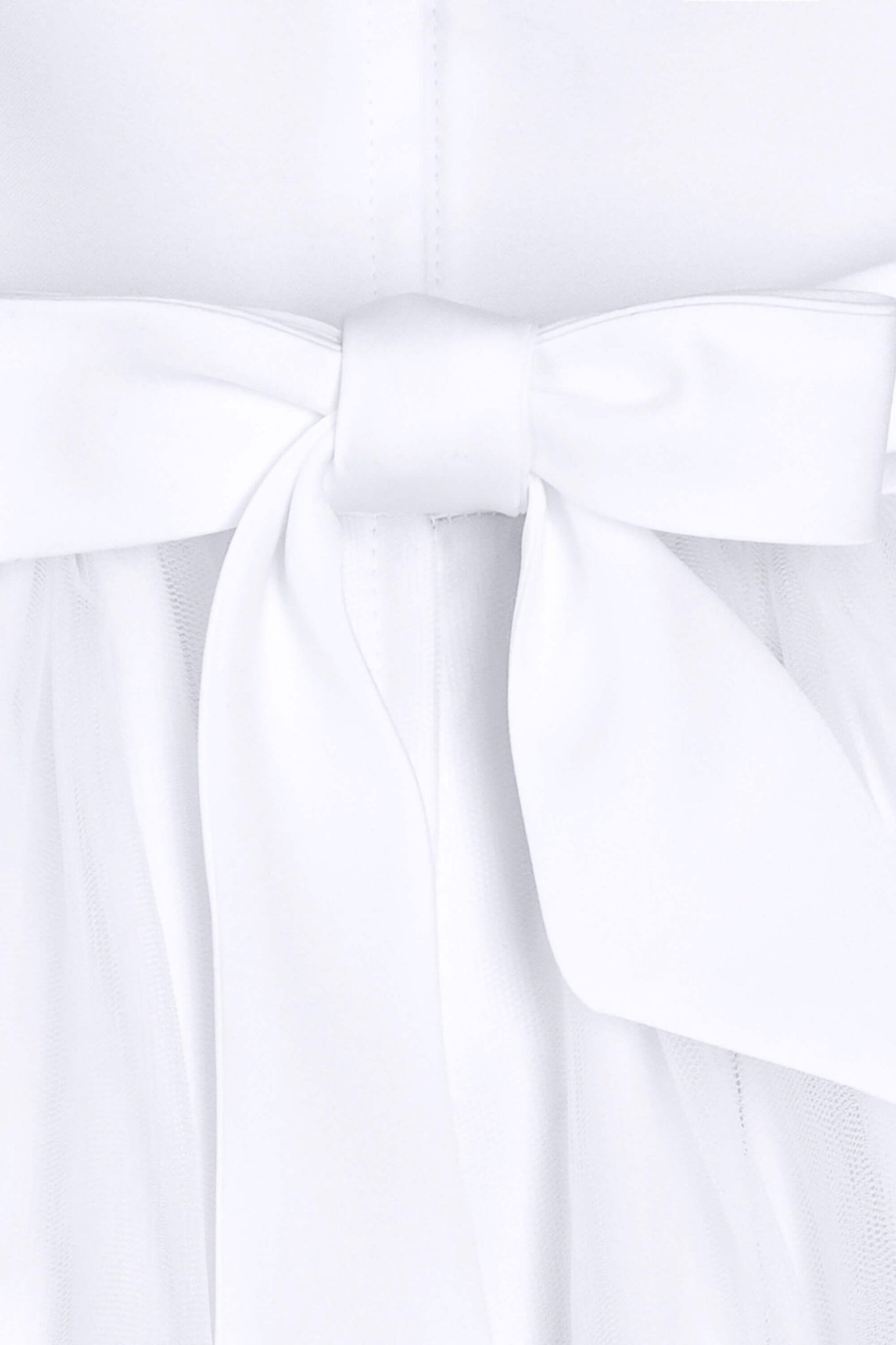 Das Kleid wird zwar mit einer gerafften festen weißen Schärpe geliefert, aber das Kleid hat die Möglichkeit, eine Schärpe darüber zu tragen, um perfekt zum Farbthema zu passen, oder eine Schärpe in einer anderen Farbe, wenn Sie einen dezenten Look bevorzugen.