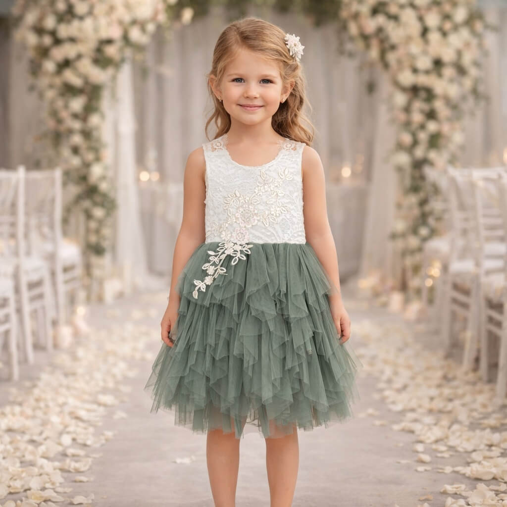 Diese sind so umwerfend, ein wirklich wunderschönes Mädchenkleid für besondere Anlässe. Das weiße Obermieder ist aus weichster weißer Qualitätsspitze gefertigt. Auf der Brust gefüttert und mit einer hübschen Spitzen- und Perlenapplikation versehen. Dazu passt perfekt der mehrlagige Tutu-Rock aus aschgrauem, salbeigrünem Tüll.