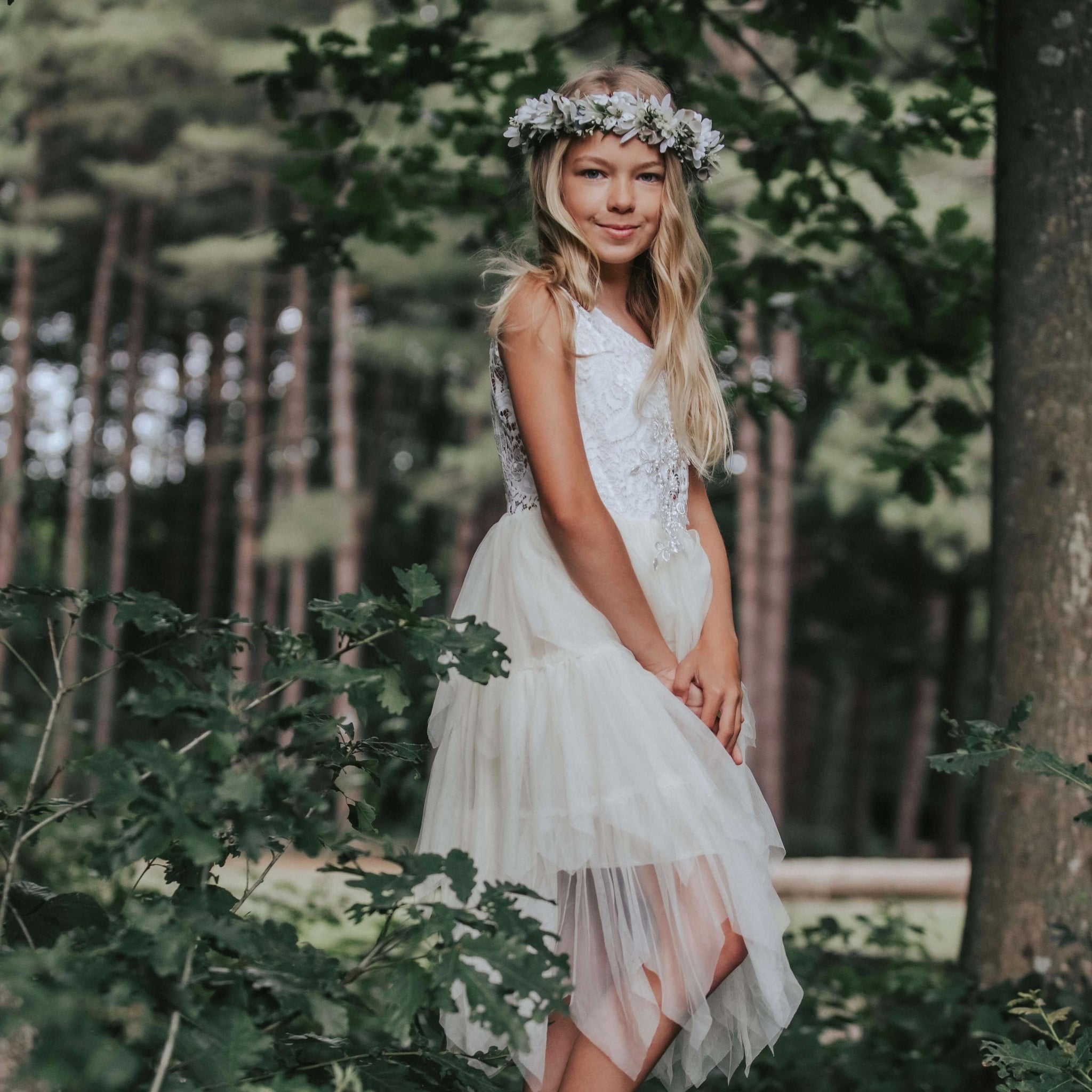 Ces thèses sont si magnifiques, une très belle robe d’occasion pour filles. Le corsage supérieur blanc est fabriqué avec la dentelle de qualité ivoire blanc la plus douce. Pièce de poitrine doublée et ornée d'une jolie applique en dentelle et perles. Ceci est parfaitement assorti à la jupe tutu en tulle crème ivoire doux à plusieurs couches.