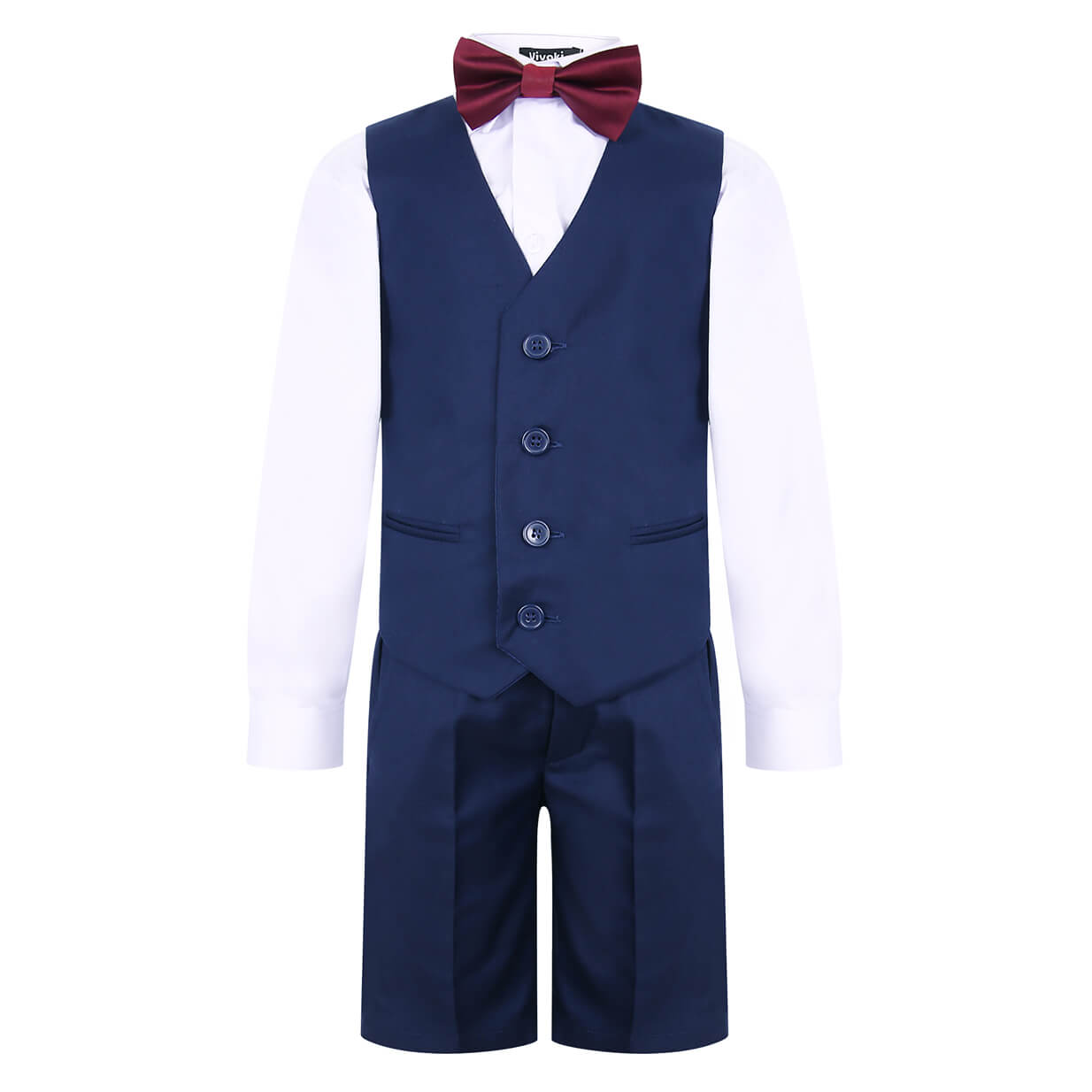 Ce costume 4 pièces bleu marine est livré avec un gilet léger, un short élastique (également disponible avec un pantalon long), une chemise blanche et un nœud papillon.