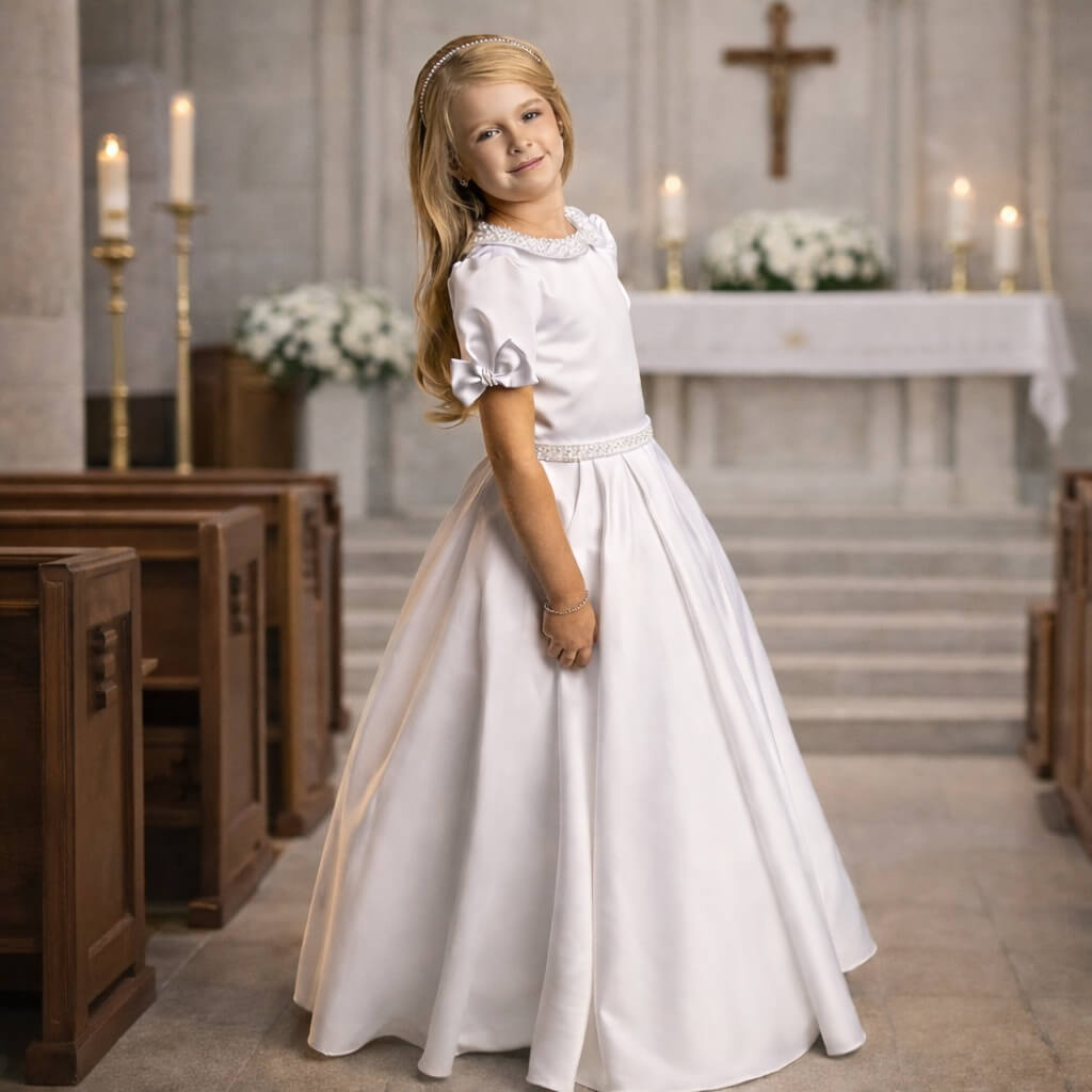 Our Lottie Dress is a beautifully elegant choice for a Flower Girl or Holy Communion , designed with timeless simplicity and thoughtful details. Classic, refined, and effortlessly charming, this is also our first-ever dress with pockets . A little surprise detail that girls absolutely love.